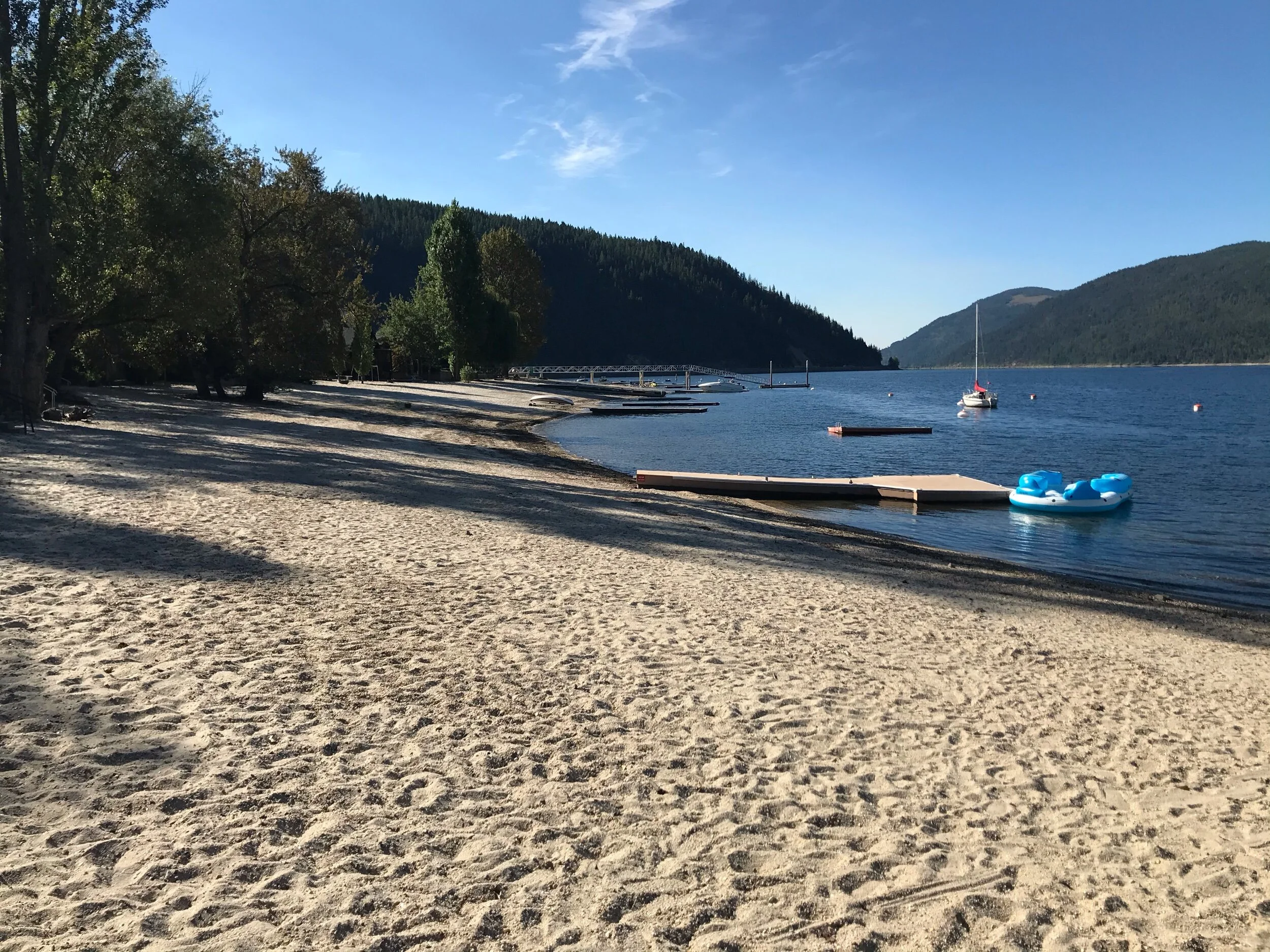 Westminster Community Park is one of seven beaches that is located in the lakeside Sicamous neighborhood known as Swansea Point. It features a beautiful white sand beach looking out onto the gorgeous Mara Lake in the Shuswap region of British Columbia, Canada. The park has all the amenities including an outhouse, picnic tables, charcoal BBQ pits, and a rustic bar table for four made by a local using a tree.