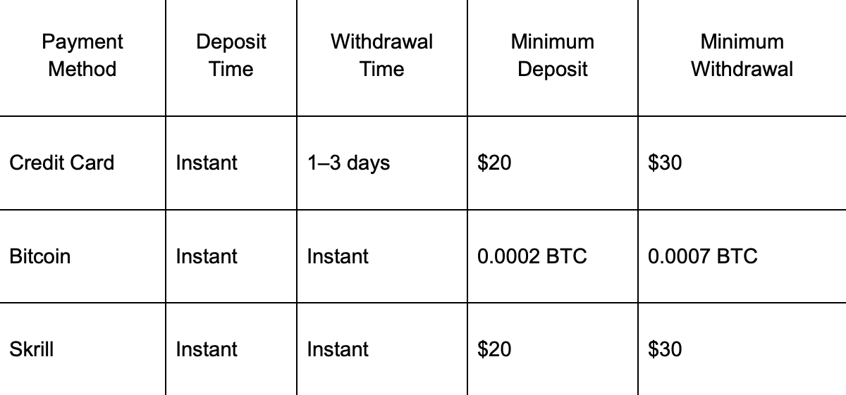 E-wallet withdrawals are nearly instantaneous, while bank transfers and card payments may take between 1 to 5 days.