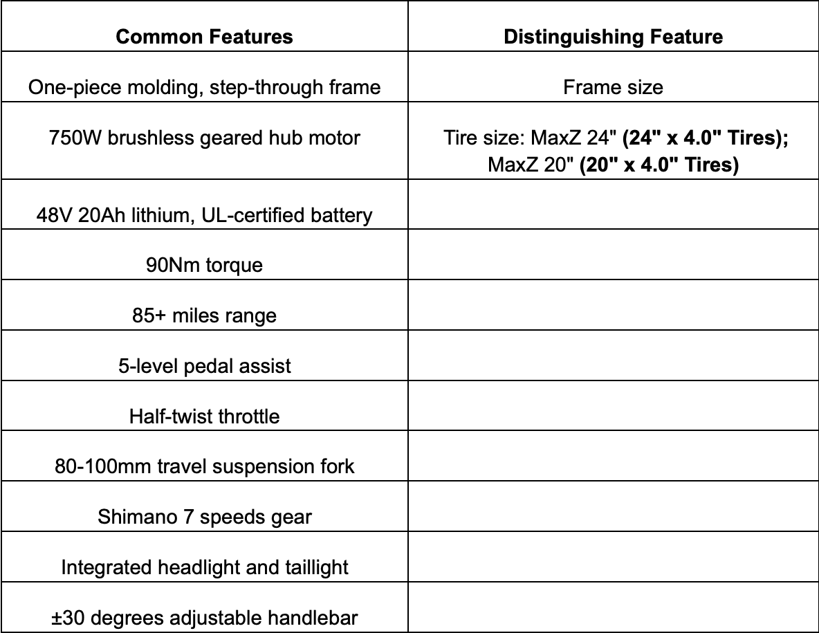 Both the MaxZ 20" and MaxZ 24" Electric Cruiser Bikes offer a range of features to enhance your riding experience. Your choice between the two should be guided by your specific needs, whether that’s the compact maneuverability and urban suitability of the 20" model or the enhanced comfort and utility of the 24" model.