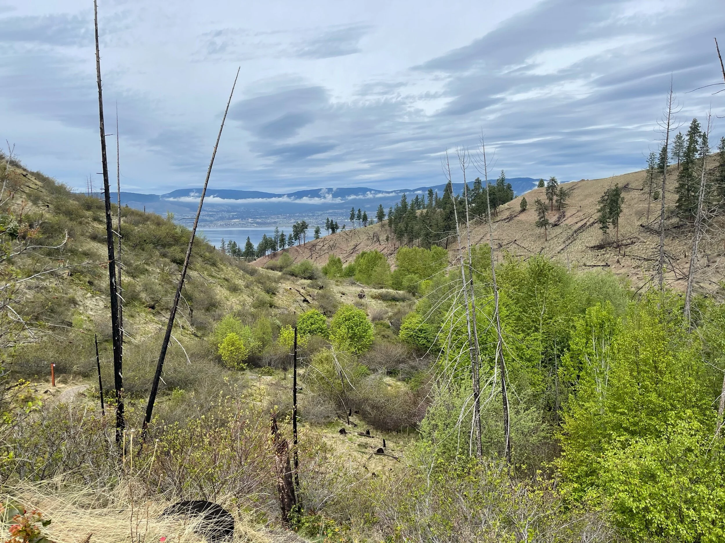 The trail itself runs 2.3 km one way and is moderately difficult. Hikers will need to trek down into the canyon and across some bridges that were built over Lebanon Creek. After the creek, you will hike up the other side of the canyon and ascend the switchback mountain trail that connects to another park called Johns Family Nature Conservancy. Once up there, you will be treated to epic panoramic views of Okanagan Lake, and you will have the option to continue to the next park if you like.