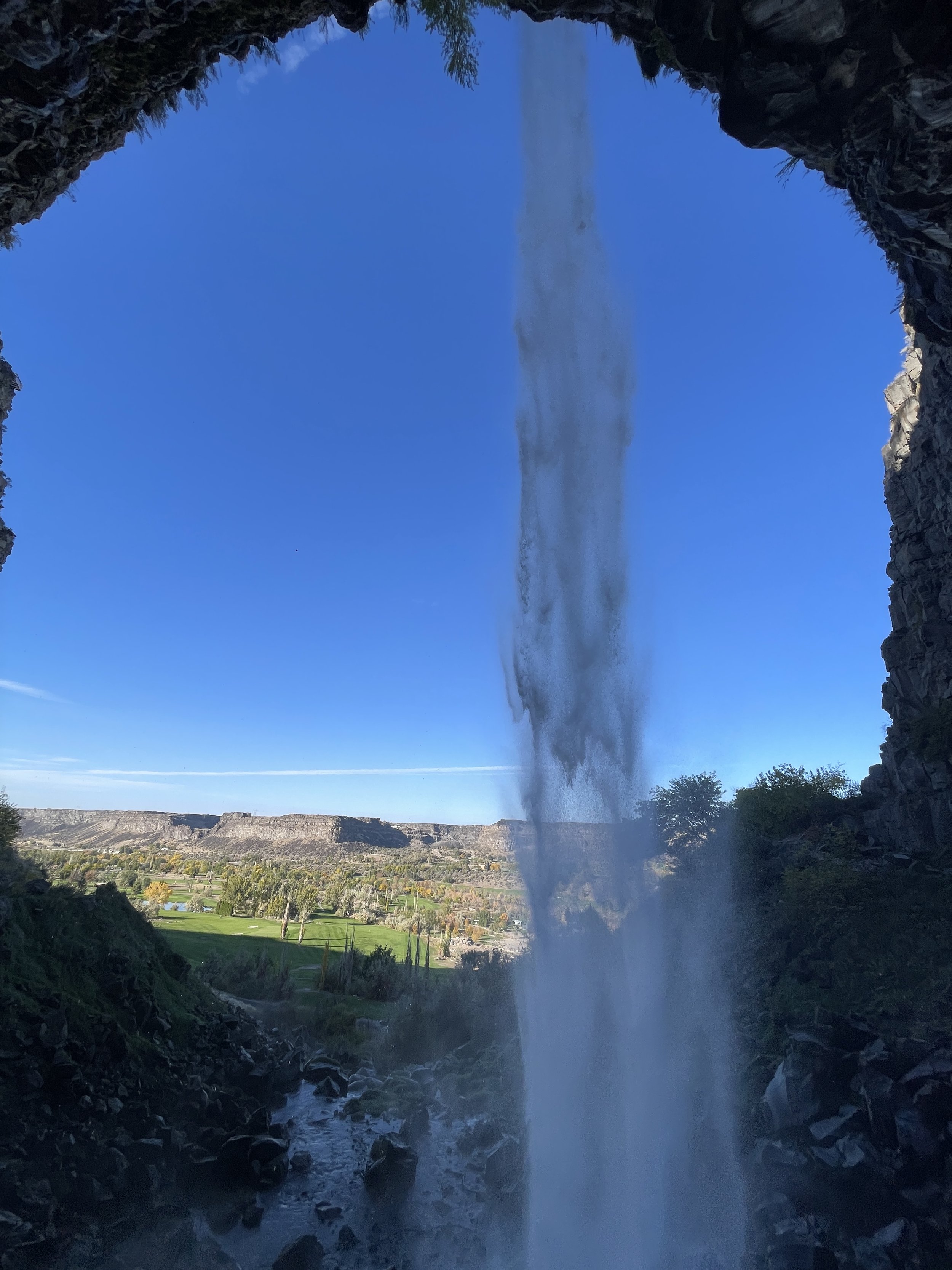 The Perrine Coulee Falls is a man-made waterfall that was the result of a canal system that was built in 1905. Before the construction of the Perrine Bridge in 1927, the only way to cross the Snake River Gorge was to go right behind the falls. The road that led people behind the falls was built by I.B. Perrine in the 1890’s. Eventually, a new road was built to avoid going through the waterfall.