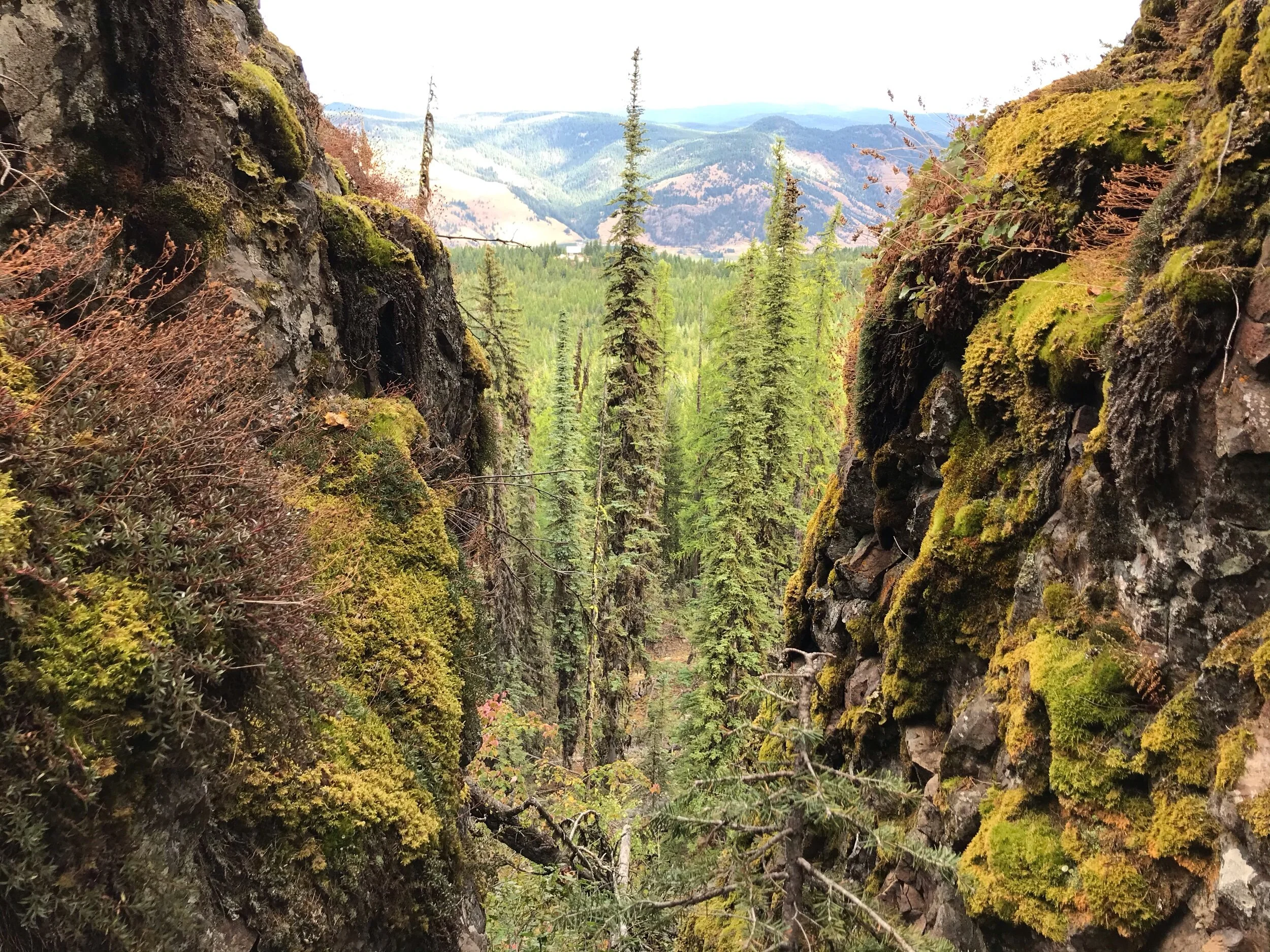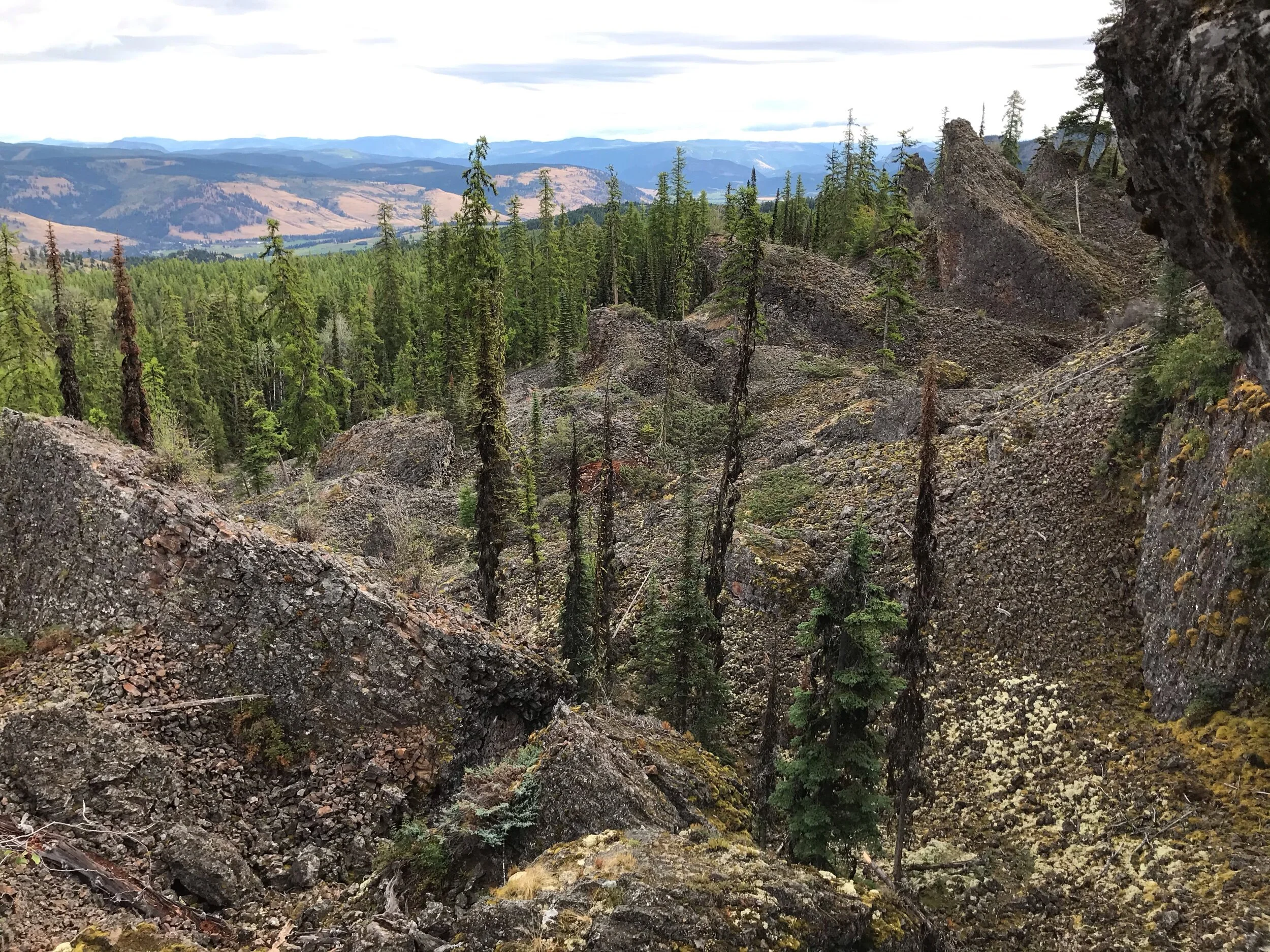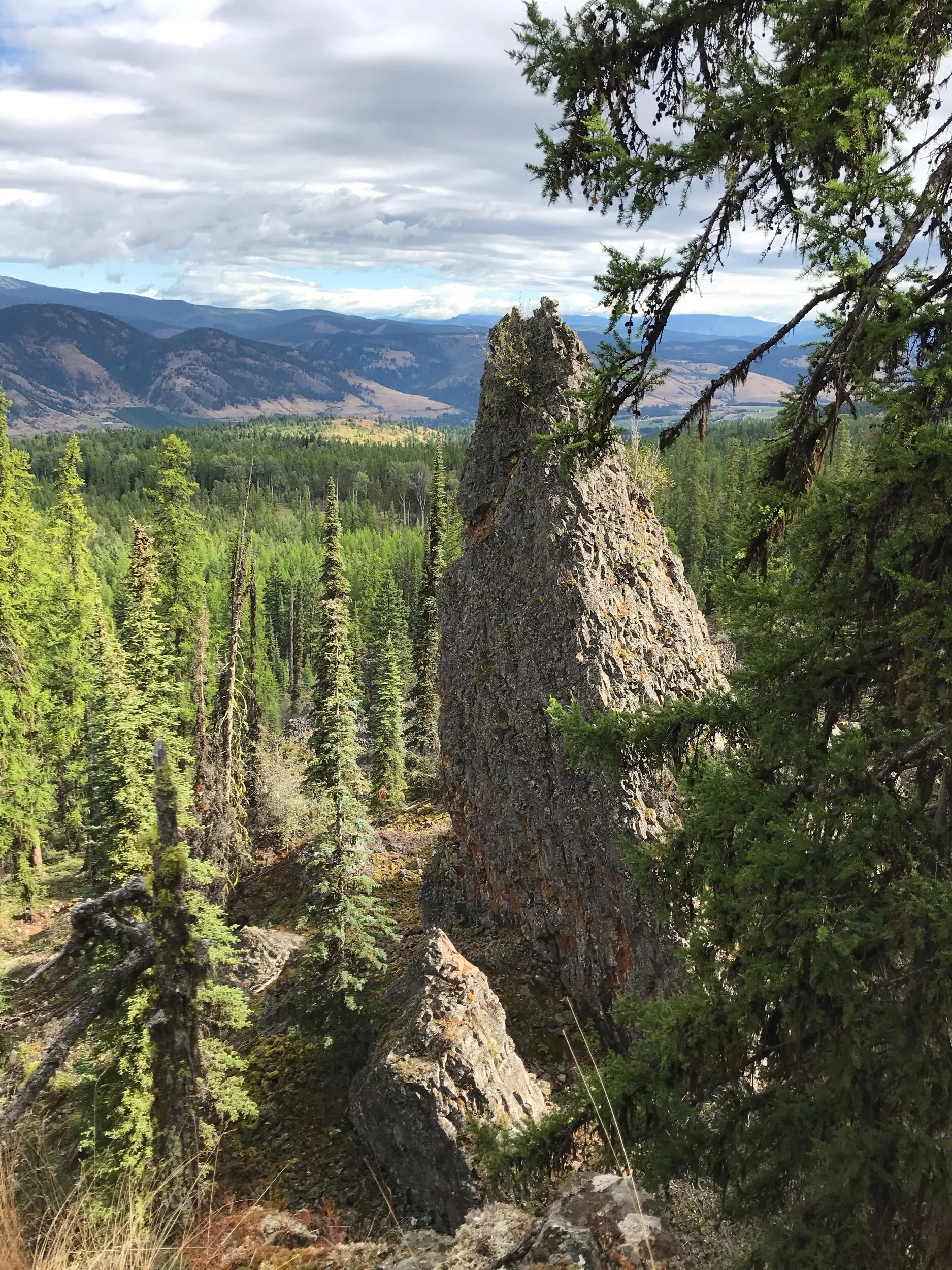 Rim Rocks Trail is a moderately difficult hike with some intense areas. It is located in the community of Coldstream and is 30 minutes outside of the city of Vernon, British Columbia. It is situated high up in a mountainous wilderness area known as King Edward. The trail takes you through logging clear cuts followed by incredibly dense forests covered in vibrant green mosses and lichens. Then you’ll meander along the top of some breathtaking cliffs and finally down into an ancient volcano to discover some incredible geology. There are large rock spires and gigantic boulders that appear to be the result of a massive eruption at some point in history.