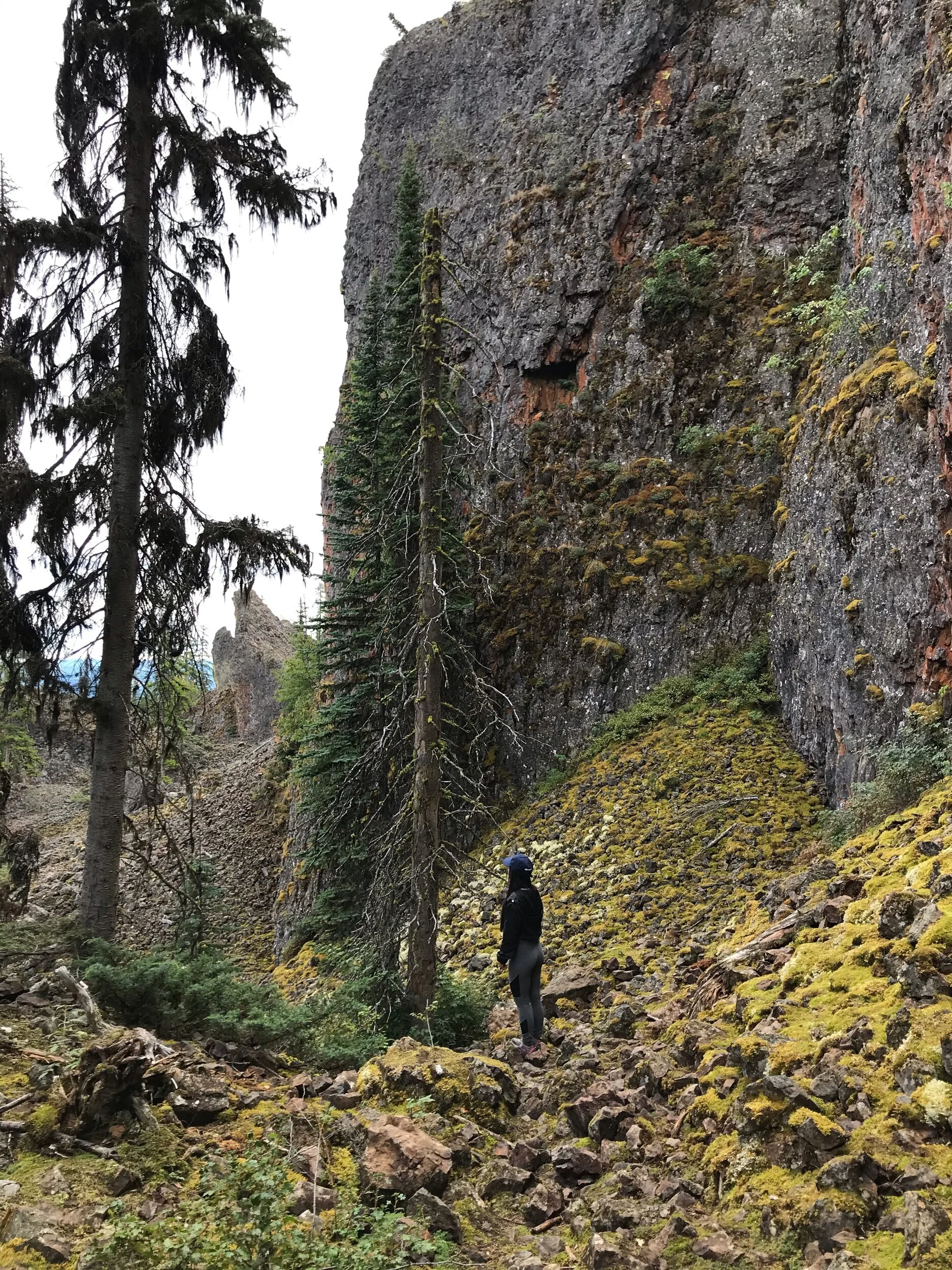 The old logging road takes you up 1.5 kilometers and eventually leads you off into the woods and up to the top. You’ll know when you are supposed to turn off because you will see a cattleguard and an amazing old 1050s era car that must have an interesting story as to why and how it got stuck way up in the mountains. Soon after you will come to a clifftop with a great view of the valley and you can see Swan Lake off in the distance. As you continue along the edge of the mountain you will start to see fascinating geologic formations like gigantic boulders breaking off of the face of the cliffs. There are many different clearings and viewpoints along the route but the real treat is when you descend down into the ancient lava field. Getting down into the lava field requires you to climb down using ropes, and is fairly steep and dangerous and it is not recommended to bring small children.