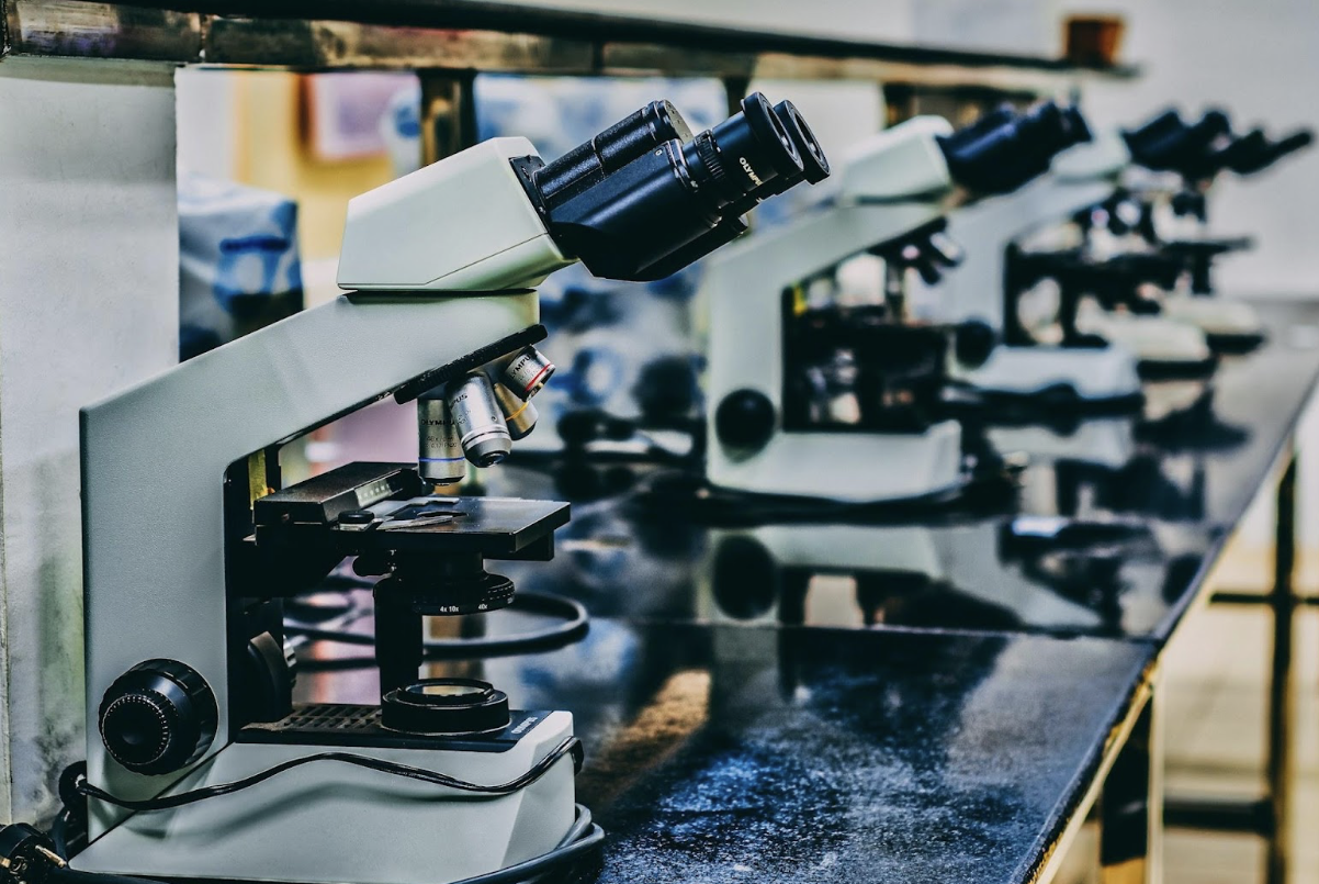 Microscopes lined up on a table