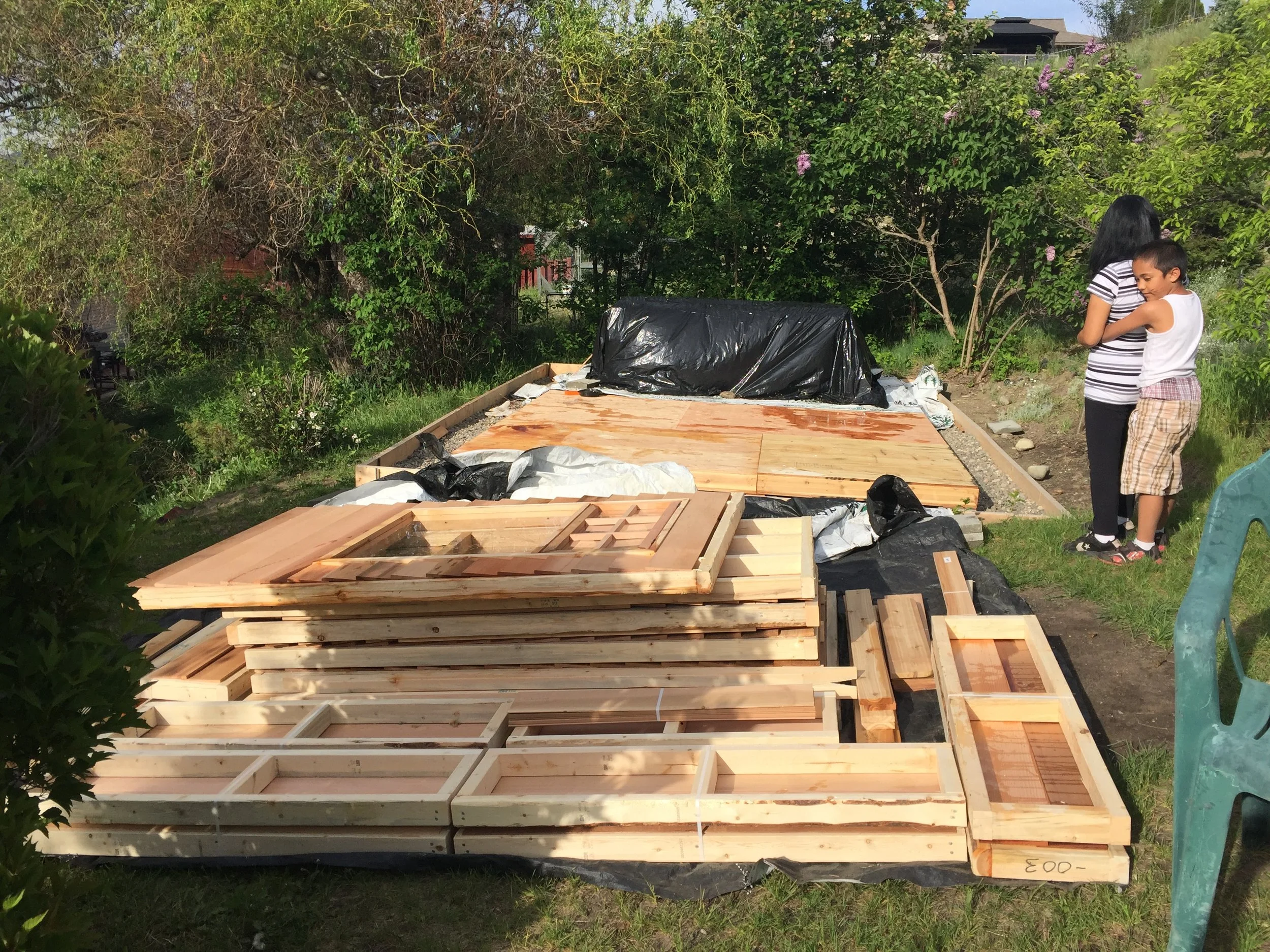 Our cabin stacked in prefabricated pieces ready for assembly.