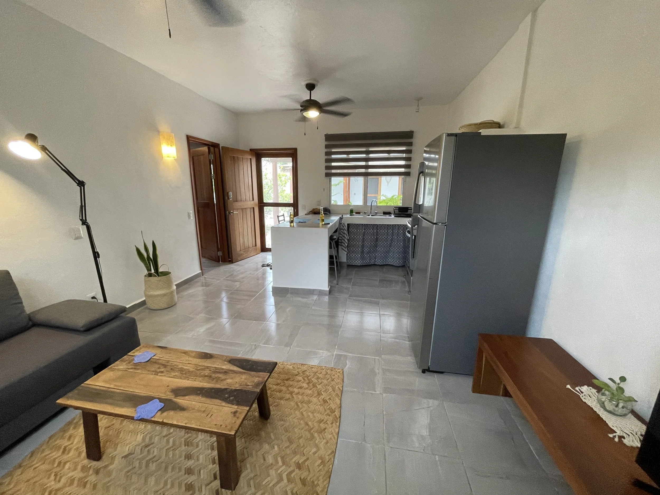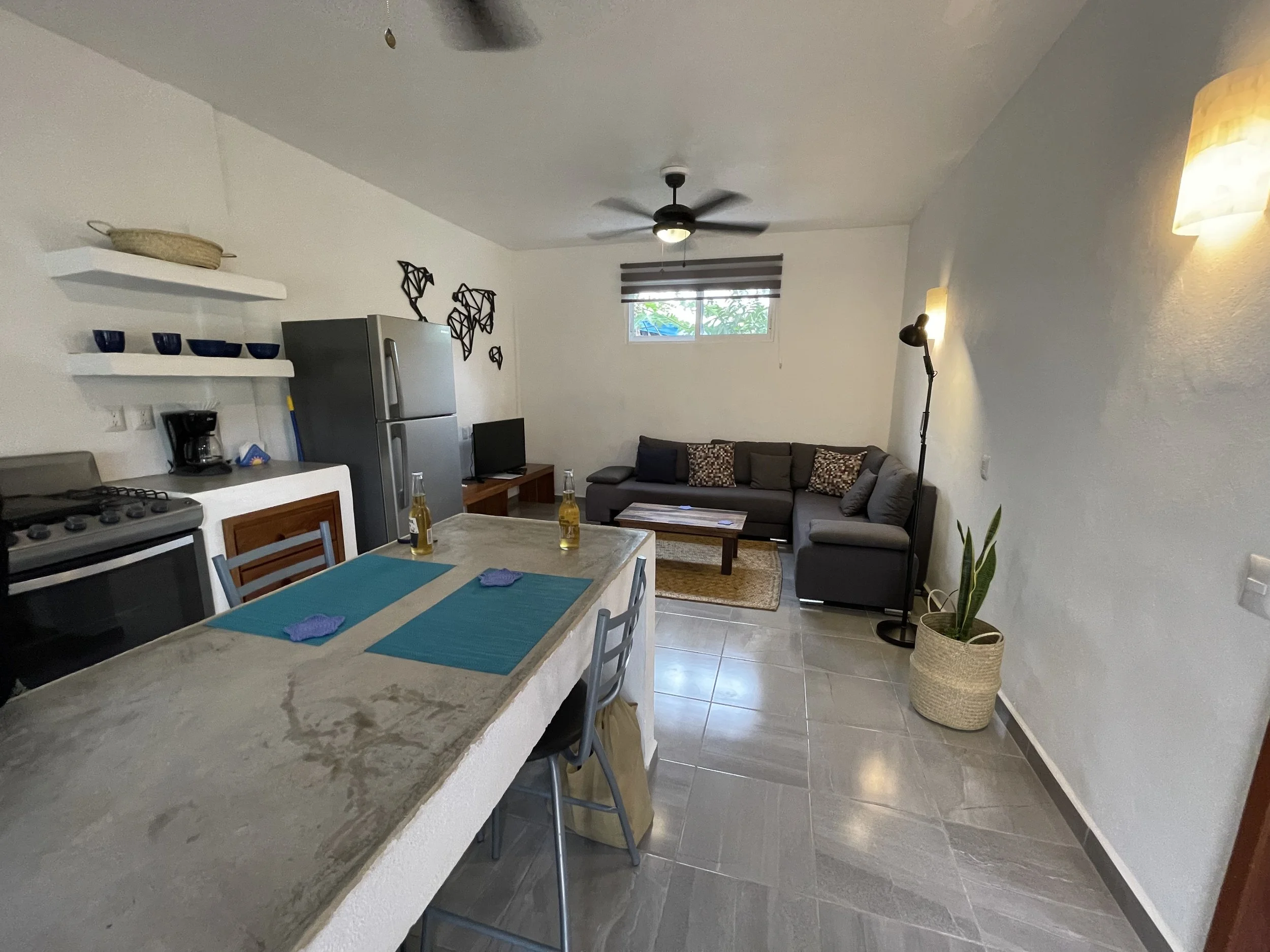 Blue Mahahual offers very clean accommodations in a quiet and safe neighborhood that is conveniently situated close to all the attractions of the area. Each condo features a bedroom with a comfortable bed and closet, a full kitchen stocked with all the basics, a comfortable living room with good WIFI and Netflix, as well as a community garden for lounging and enjoying the peace and quiet. There is a washing machine on-site that guests can use at a cost of $50 MXN ($3.18 CAD - $2.49) per load and drying racks to hang the clothing afterward. The hosts also offer daily bike rentals for $50 MXN per day for the older bikes and $100 MXN for the newer bikes.