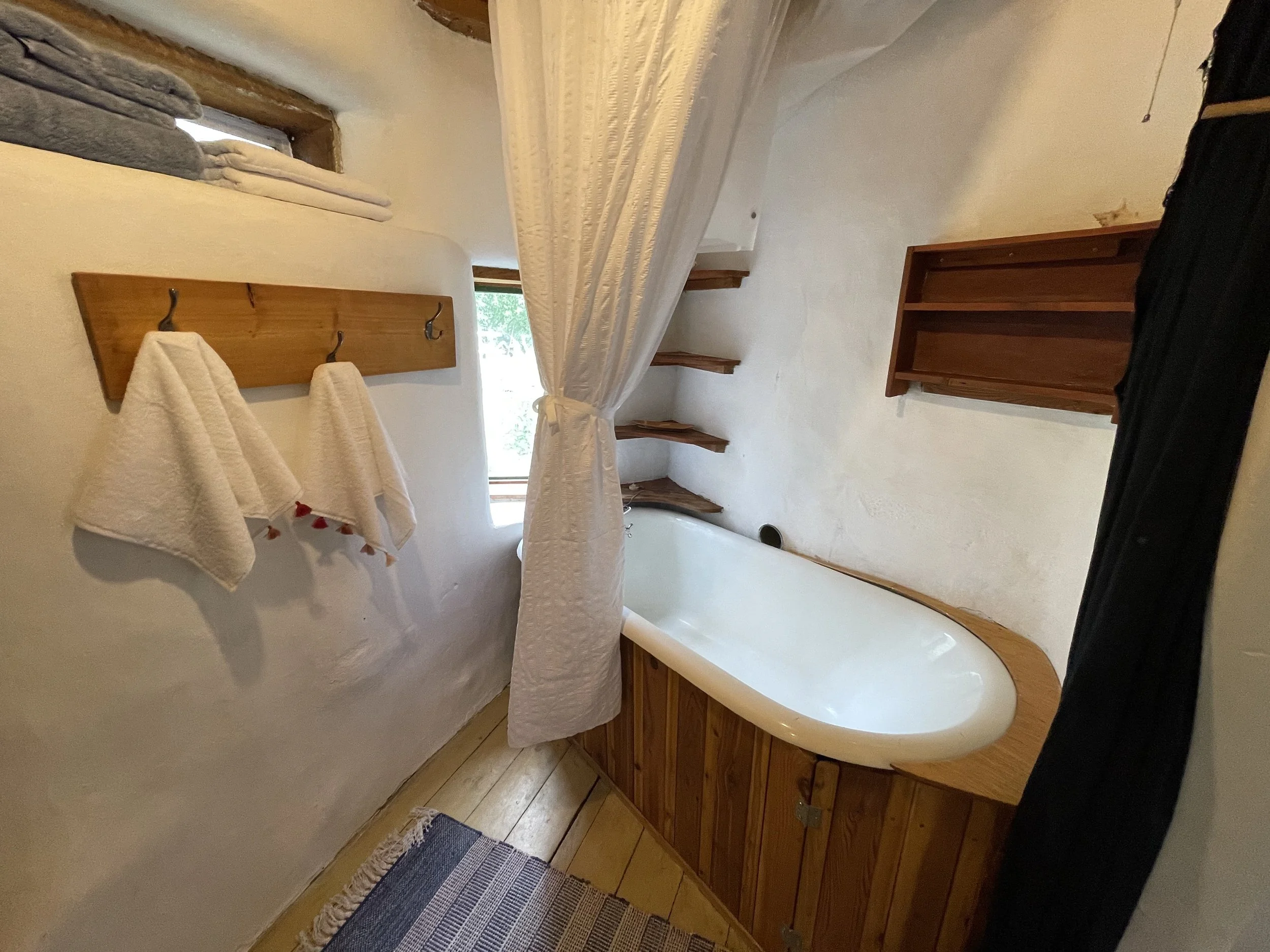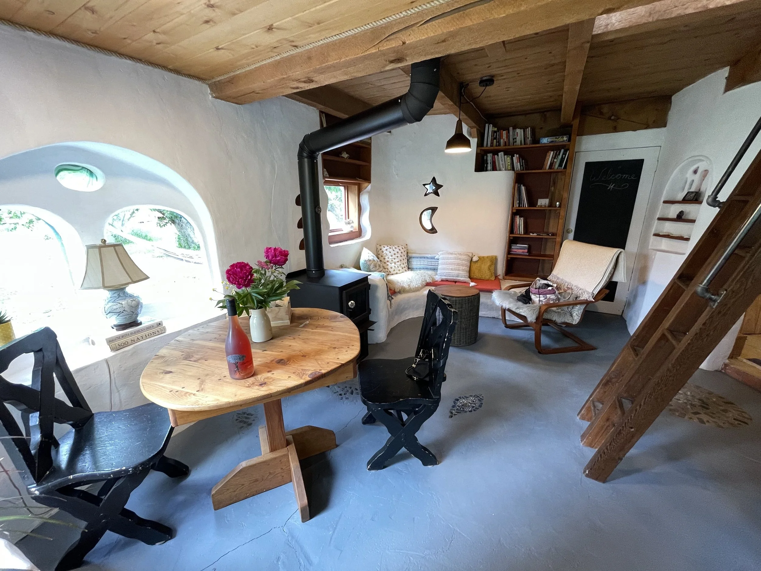 Inside the Cob House, guests will find a full kitchen, a sleeping loft with splendid views of the valley, a half bathroom with a tub, a wood stove, a patio, and an outhouse. Not only does the Cob House have all the necessities one would need for a great stay it also checks all the boxes in terms of creativity, as there are tons of cute little details.